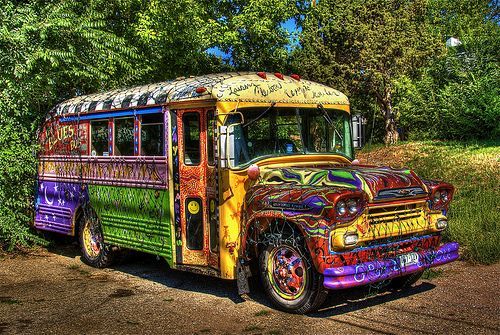 Stepping out of the bus with a thick rope tied around the neck of a golden-colored pit bull was a short man about five feet tall. His dark sunglasses prevented anyone from seeing his eyes, which, based on the colors of the bus, were dilated from L.S.D., mushrooms, or some other kind of hallucinogen.