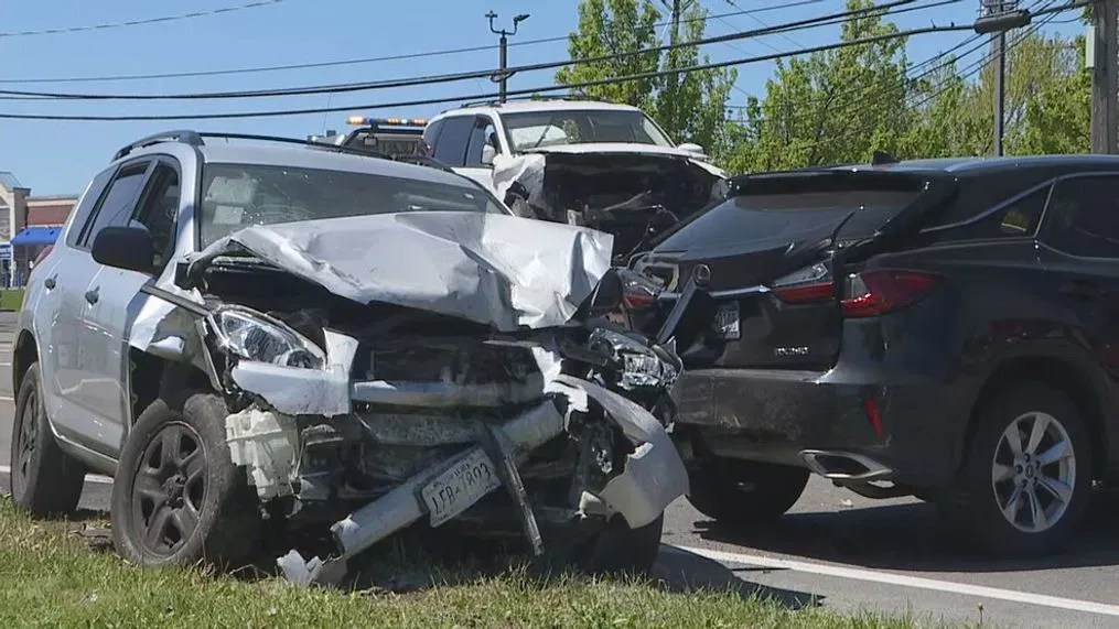 Broken glass. Various parts of the Element, the Ford truck, and the other two cars, both passenger vehicles, strewn through all the lanes, the bumper and headlamps from the Element lying in front of it.